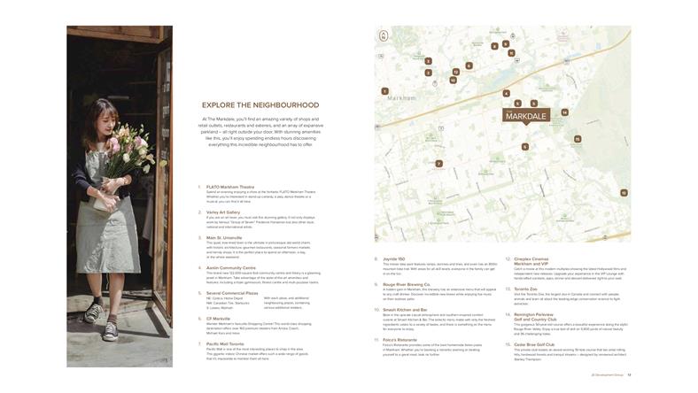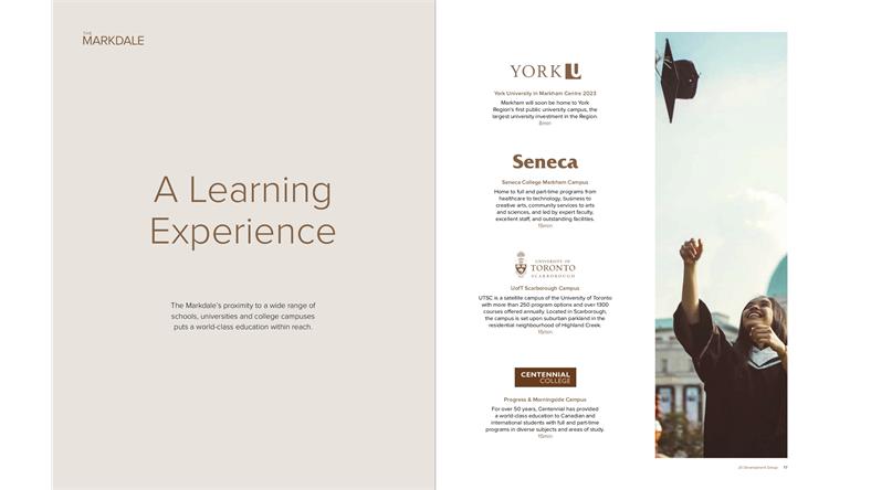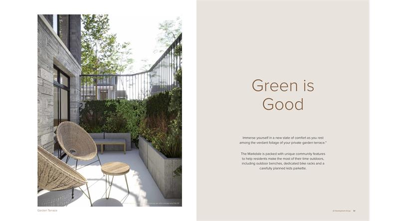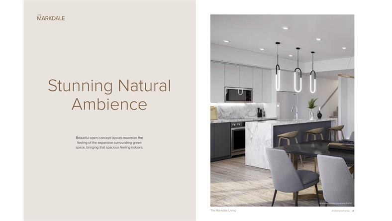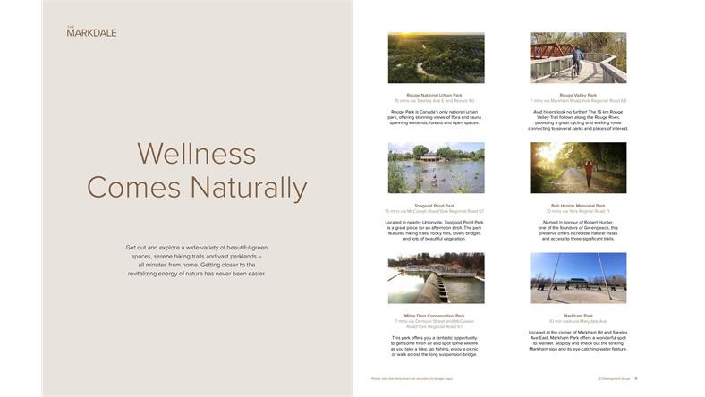 The Markdale是一个生活便利的地方,一个为家庭成长和繁荣提供各种可能性的地方,同时又和大自然非常接近的地方。住在The Markdale, 居民能俯瞰景观绿地,和大自然又重新链接起来。The Markdale是户外活动爱好者的理想居所。深受高尔夫球手喜爱的Markham Green Glof Club 就在附近。并且附近的徒步小径能通向三大森林公园:Rouge National Urban Park, Rouge Valley Park 和Milen Dam Conservation Park。居民能尽情享受大自然带来的休闲和乐趣。