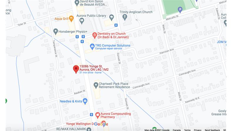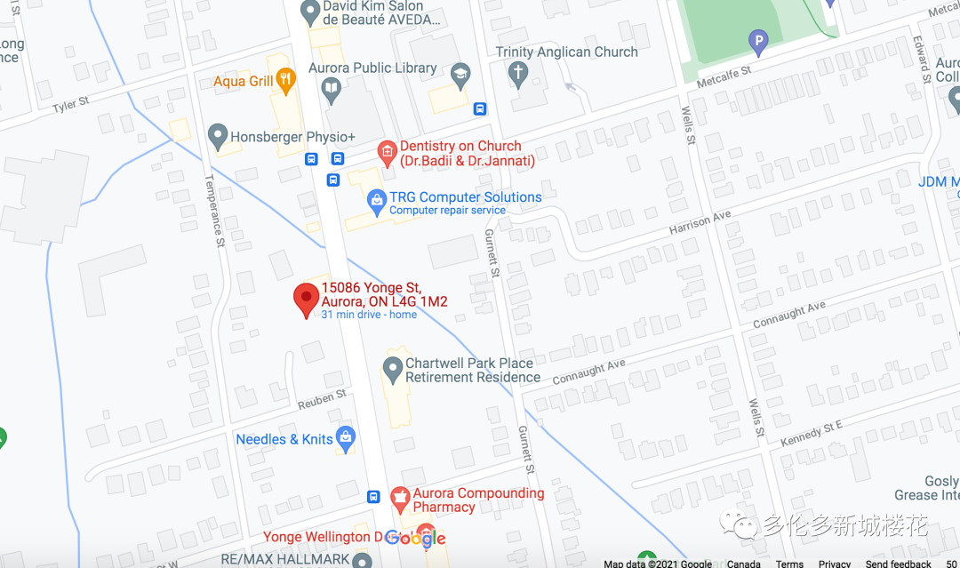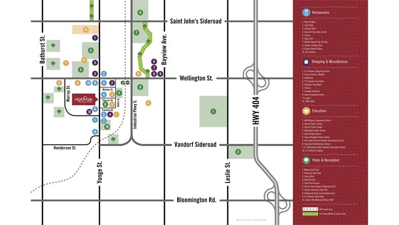Yonge & Wellington附近的Aurora Go Station可以为通勤者提供火车及公交服务,通往巴里线(Barrie Line)沿线至联合车站(Union Station)的所有站点;