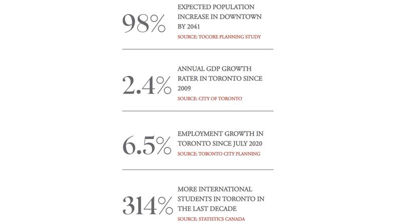 252 CHURCH附近比邻金融商务区和娱乐区,大多地区近1/3的工作职位出自Downtown;BMO银行即将于2021年落成使用,全新就业中心就在Eaton Centre附近,打造的四楼高科技综合性商务办公区域“Urban Campus”,提供了超过3500+个就业岗位。未来20年,Downtown核心区的工作岗位数量还将持续上涨至十几万个。巨大的人群将成为公寓的招租目标。