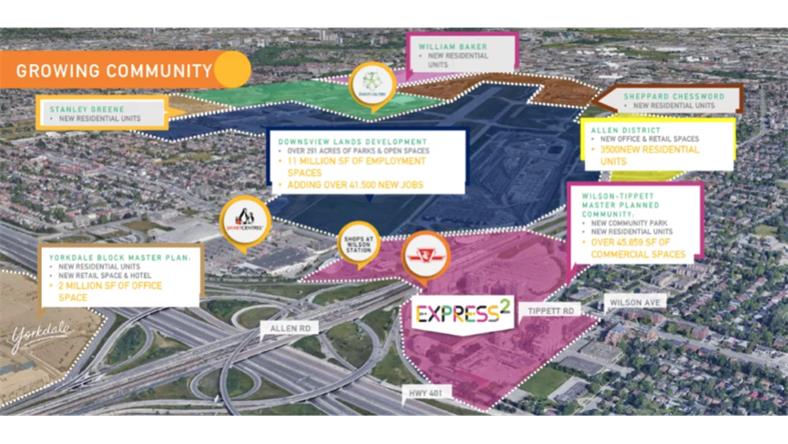 「Express 2 Condos」是多伦多市北约克西部在开发的8个社区里的其中一个,叫Tippett Road Development。市政府对提升此区域的功能和规划上给予了非常多的重视和支持。越来越多的开发商也据此选择此区域进行公寓项目的开发。同时, Express Condos位于地铁新线的中间,Wilson站旁,再加上这里有着多种多样的餐厅和娱乐场所,Express Condos 这里必将成为约克大学学生的下一个聚居地。特别的是,Express Condos还依靠着多伦多市内为数不多的绿地公园Donsview Park,在如此优渥的社区环境中,更会成为更多学习、工作的年轻人,买房及租房的首选之地。Malibu是Tippett Road Development的主导开发商,在这个区已经开发了很多项目。2013年建成的Gramercy Park Condo, 2021年建成的Southside Condo,和3年半前预售的Express Condo一期,目前接近封顶。这次是将要出来的是Express Condo二期。周围有3个工作商圈,过10万的工作机会。还有两个大型的公园,Tippett Park和Downsview Park, 从社区中心,到运动会馆,再到演唱会场应有尽有。