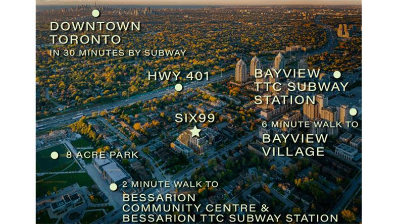 Sheppard Ave. East是Six99 Condos的主干道之一,为当地居民提供了许多便利的生活设施,非常适合步行。三个TTC地铁站均匀分布在这条街道上,出门步行就可以到达Bessarion站,Oriole GO站也仅需几分钟的路程就可以到达,乘坐地铁到多伦多市中心仅需30分钟,几乎做到“门对门”。4分钟驾车就可以连接的401高速更是让该地区大的居民轻松“穿梭”在整个多伦多地区。 著名的Bayview Village购物中心在Six99 Condos的不远处。它是Bayview Village社区标志性的地点之一,这里有大型超市以及五光十色的餐厅与商店,属于比较高档的商业中心。 大量的专业诊所分布在该社区,其中包括大型医院Toronto General Hospital,多伦多最大健身中心之一的North York YMCA。 该社区也有众多专业机构为华人提供服务,华人超市、中餐馆、旅行社更是琳琅满目。 多个环境宜人的公园、步行小道例如著名的Don River,Blue Ridge Park、Bayview Village Park、Alamosa Park也遍布于Six99 Condos周边。是工作学业之余休闲放松的好去处。
