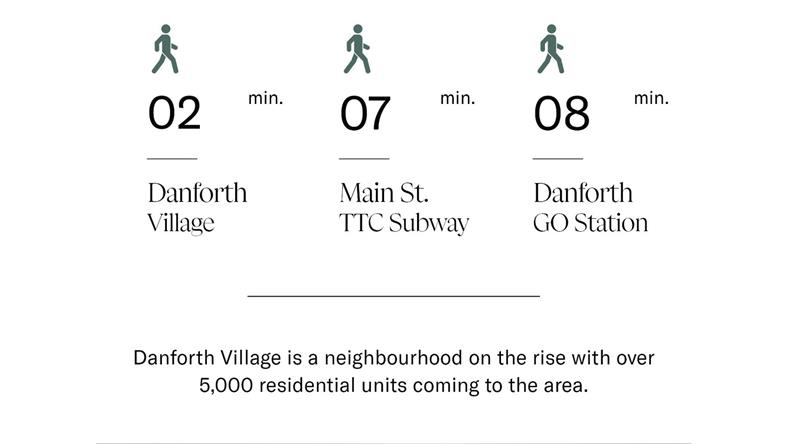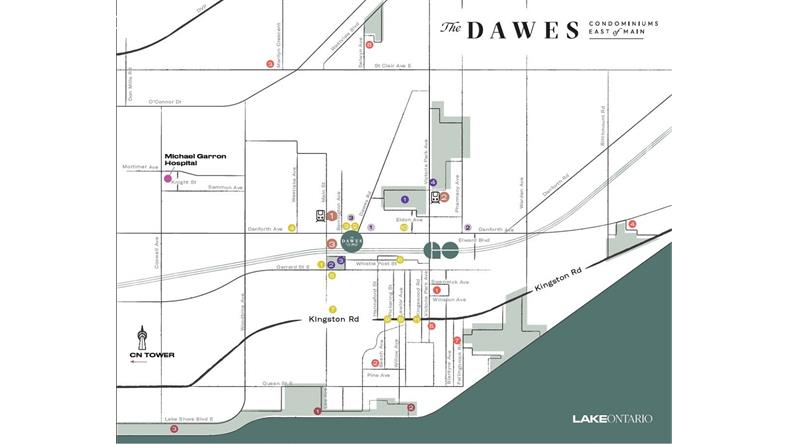 The Dawes豪华公寓位于多伦多Danforth Village成熟社区内,Danforth Ave 与 Main St的交界处,由著名开发商Marlin Spring承建,有南北两幢楼,其中北楼现正发售。