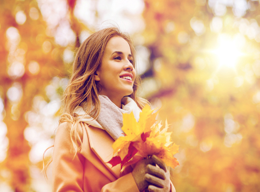 入秋时节,天气微冷,穿着白色、米色、驼色、卡其色等浅色针织衫,与秋日金黄、火红的背景非常合适。