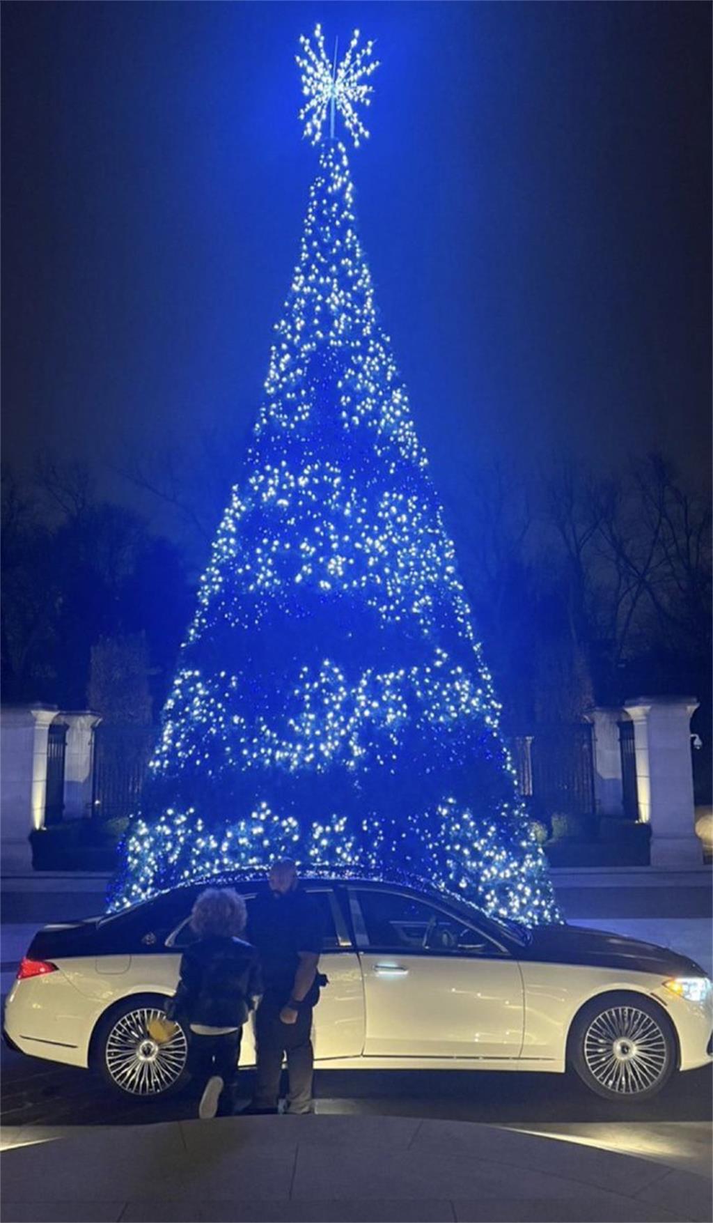 很难从那张照片中判断出这棵树有多高,因为它被砍掉了,只看到迈巴赫,但另一张上传到 Instagram Stories 的帖子证明了圣诞树确实非常非常大.