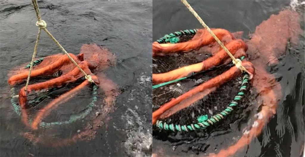这个巨大的生物搭上了一张由船拉上来的网,浮出水面。章鱼紧紧抓住渔获物,即使它被带到略高于海浪的地方。