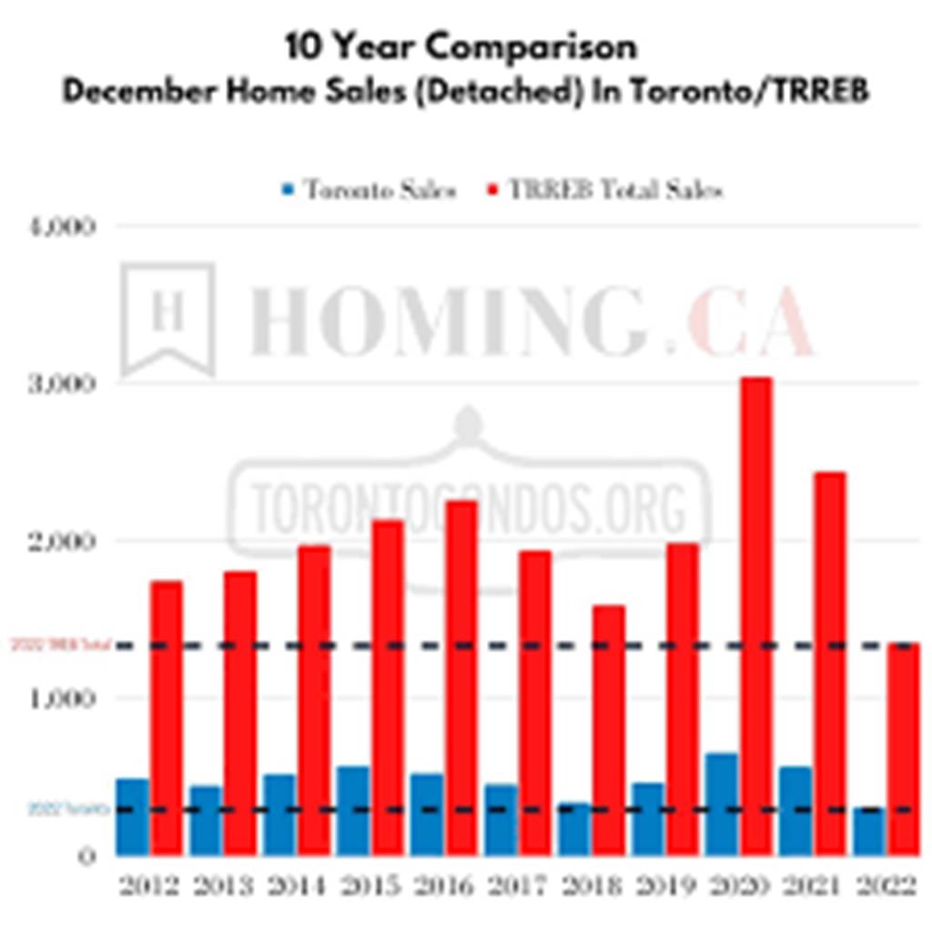 2022 年 12 月房屋销售创下历史新低。专家部分归咎于加拿大央行大幅提高利率,以至于大多数人不再有资格获得抵押贷款。图片来自 homing.ca。