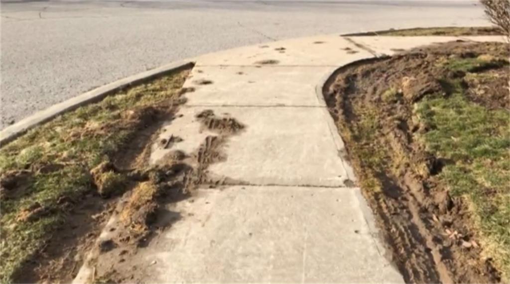 视频显示,人行道两侧的草在街道的很大一部分上都被撕裂了。