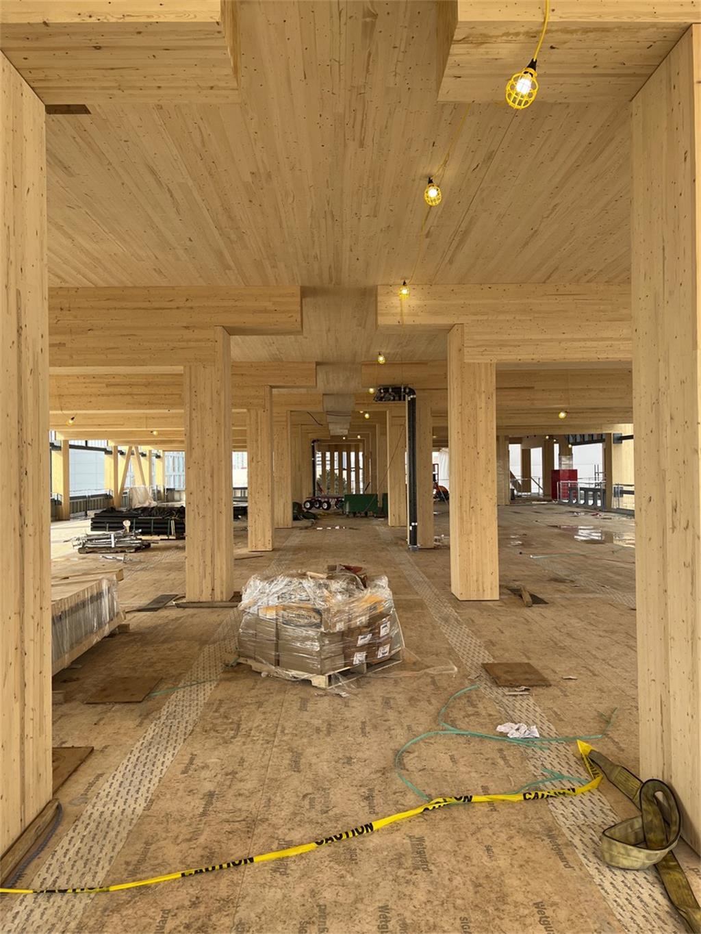 本周,这座建筑的建设跨越了一个重要的里程碑,一座全木结构的人行天桥被吊装到位,将 Limberlost Place 的六楼与隔壁达芙妮科克威尔健康科学中心的五楼连接起来。