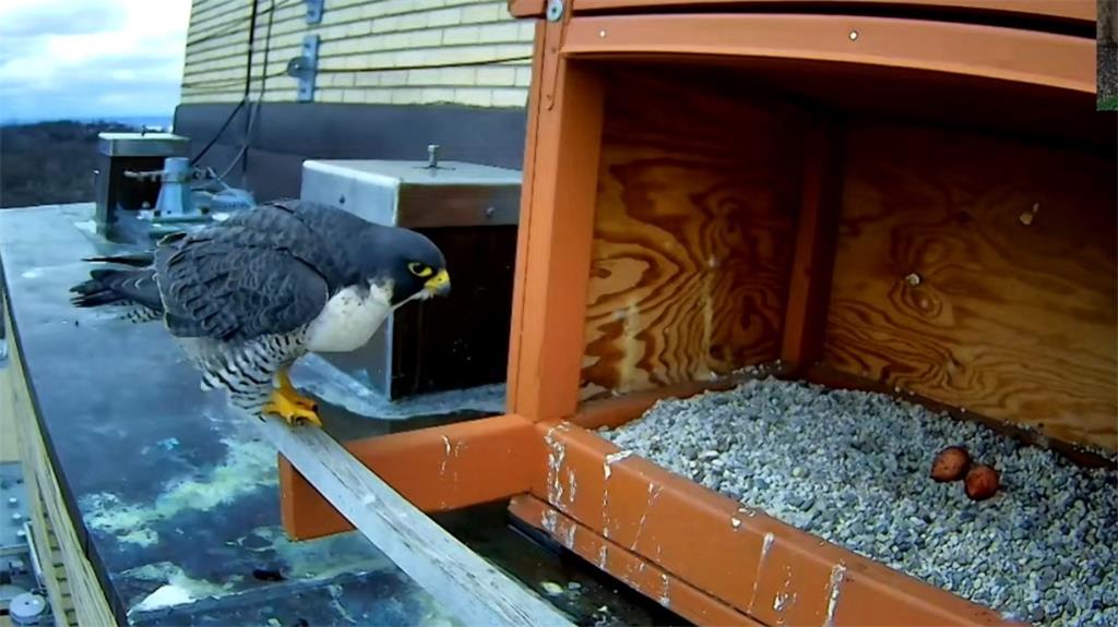 两只游隼栖息在蒙特利尔大学校园顶层为它们专门打造的特殊巢箱中,人们通过全天候 24 小时直播与这些小动物保持同步。