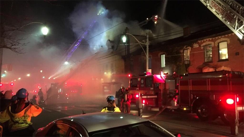 其中一名旁观者与 blogTO 分享了一段混乱的视频,视频显示消防员爬上梯子并用水浇灌建筑物的二楼,试图控制火势。