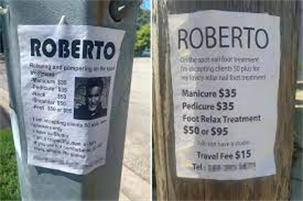 罗伯托在多伦多街头声名鹊起,因为他在公共场所张贴了一些令人毛骨悚然的标志,几乎是锣式的,他的生意是这样的:一个可供 50 岁以上女性租用的移动足部水疗中心。