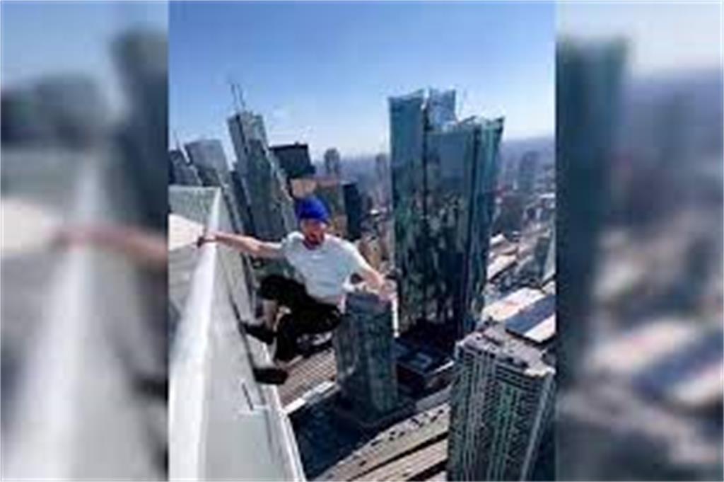 一段可怕的视频显示,一名大胆的屋顶居民在多伦多摩天大楼顶上与死亡调情,互联网对这一令人不安的危险特技做出了恐怖反应。