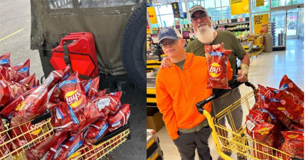 照片中,父子俩自豪地推着购物车拍照,车里装满了袋装的乐事番茄酱片,这是加拿大独有的美食。