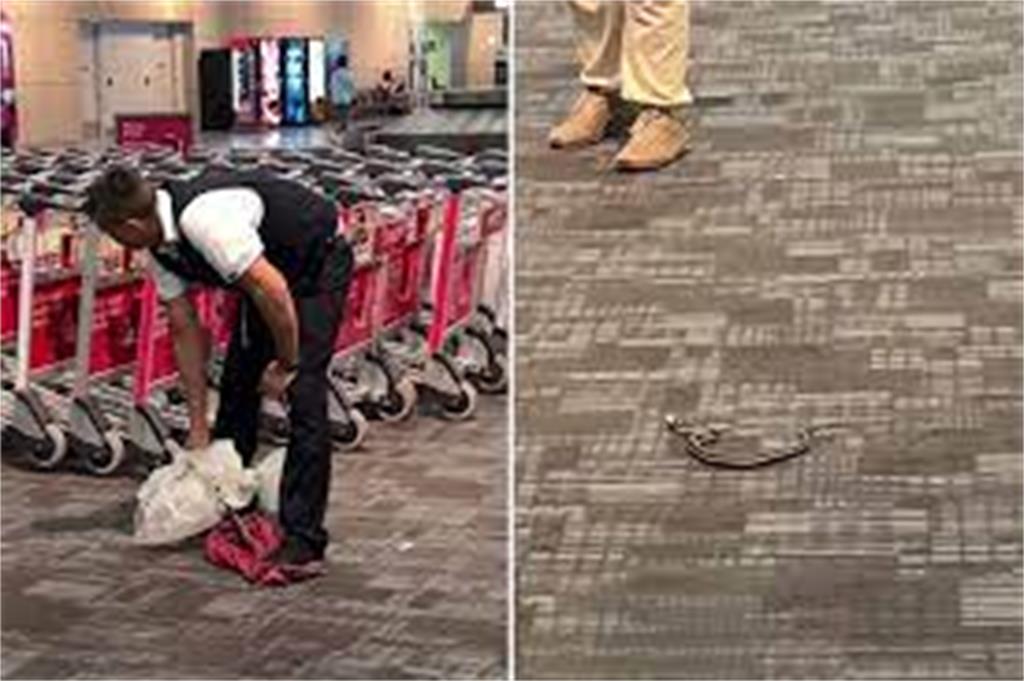 本周,多伦多皮尔逊国际机场又是一个(反常)正常的一天,在旅游中心的行李认领区拍摄到一条真正的蛇在到处游荡。