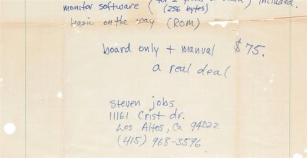 RR 拍卖指出,乔布斯标价 75 美元购买 Apple-1 的主板和手册,“提供了个人计算早期的迷人快照,以及乔布斯为让广大受众能够使用计算而采取的富有远见的立场。”