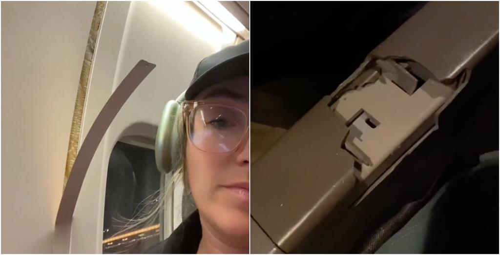 她还展示了一个损坏的扶手,上面似乎有塑料碎片。