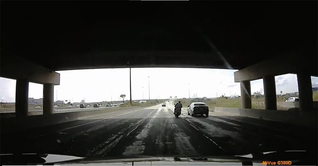 车辆记录中的司机和乘客注意到摩托车手以危险的速度从他们身边经过。然后,它显示了一名摩托车骑手从高速公路上撞入沟渠的那一刻。