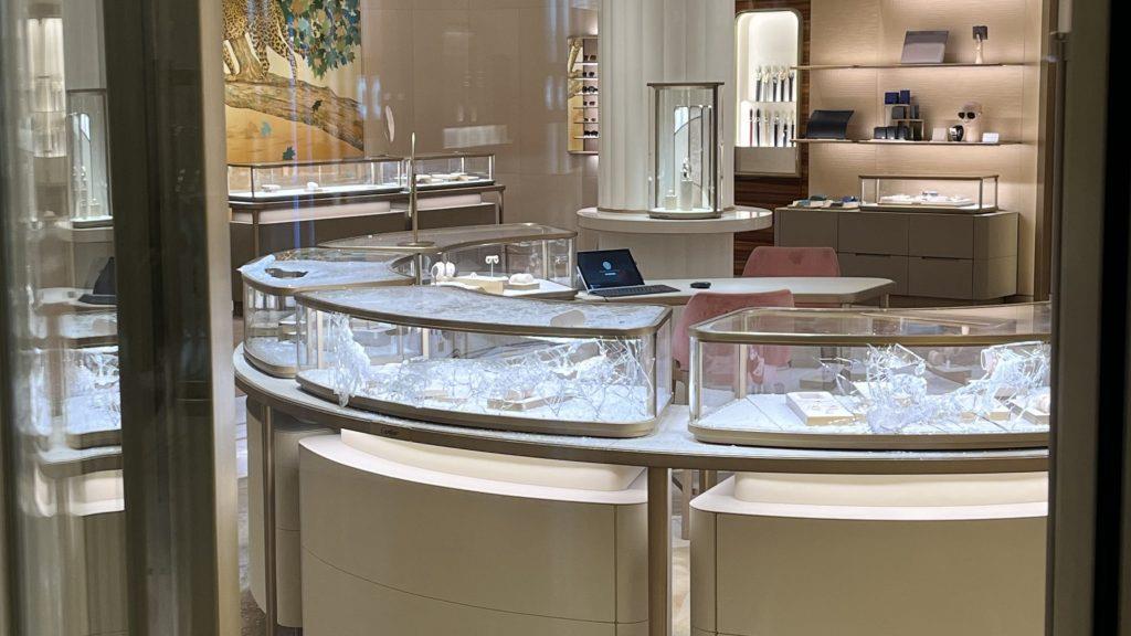 据称,三名男性嫌疑人进入卡地亚商店,砸碎陈列柜,然后带走数量不明的产品。