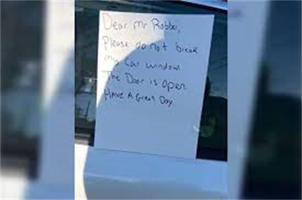 纸条上写着:“亲爱的强盗先生,请不要打破我的车窗。车门是开着的。祝你有美好的一天。”视频镜头转向汽车座椅上的多个水瓶和泰迪熊。