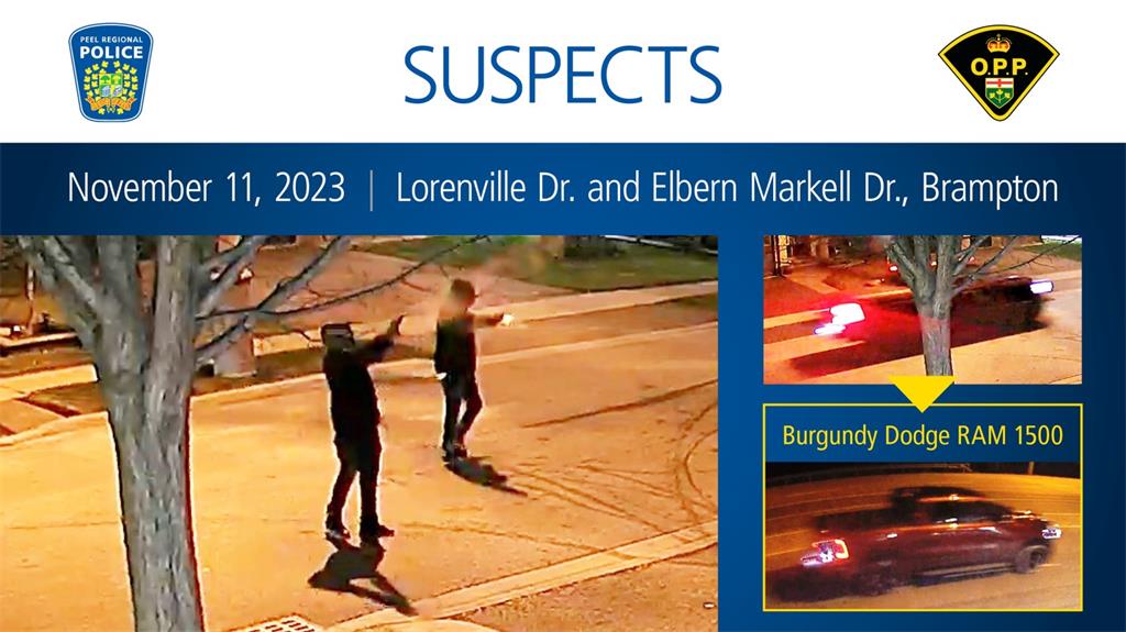 2023 年 11 月 11 日,警方接到报告称,布兰普顿 Lorenville Drive 和 Elbern Markell Drive 地区的一处独立住宅发生枪击事件。两名身穿深色连帽衫的嫌疑人向房屋开枪,然后乘坐一辆酒红色道奇 RAM 1500 皮卡车逃离。