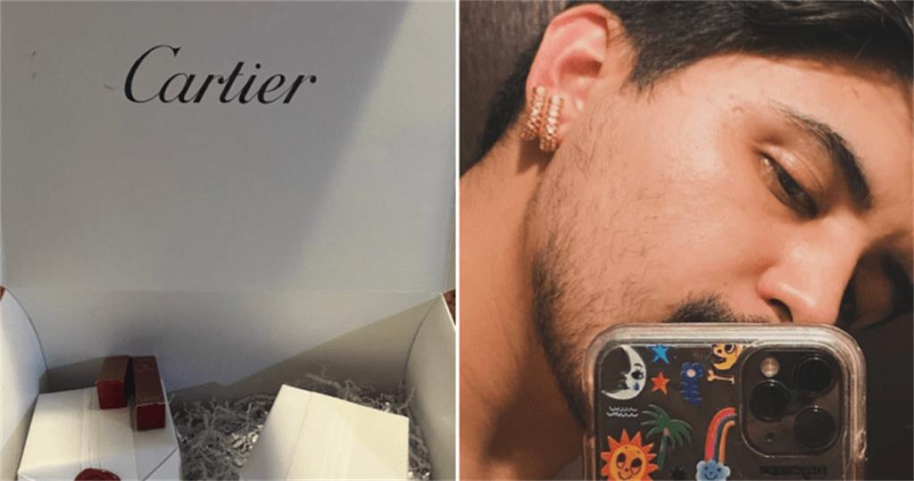 耳环终于在 4 月 26 日到货。比利亚雷亚尔贴出了一张耳环盒的照片,耳环盒用白纸包裹,并用卡地亚蜡封固定,还有一张他戴着钻石和金色耳环的照片。