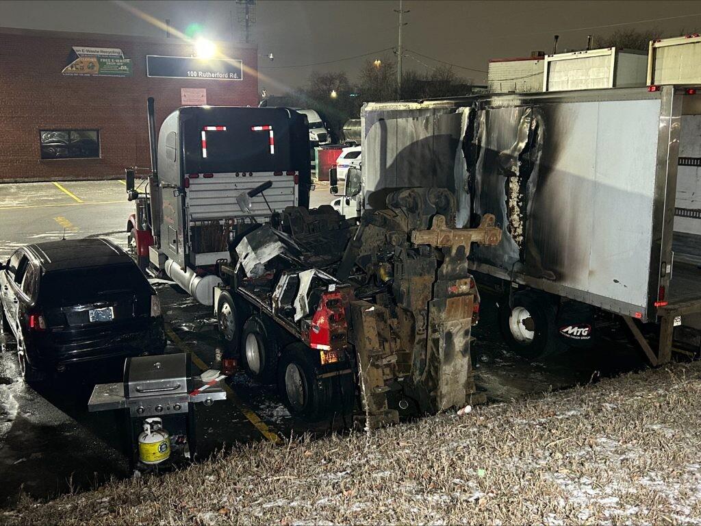 警方表示,凌晨3点16分左右,紧急救援人员接到报警,赶赴位于南卢瑟福路(South Rutherford Road)100号的 M. Johal 汽车修理有限公司。消防人员抵达现场时发现,两辆重型拖车、一辆轿车以及一辆厢式货车正被大火吞噬。