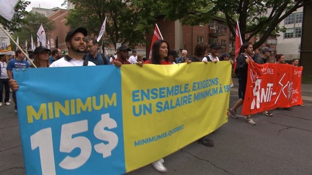 上星期世界社会论坛在蒙特利尔举行,包括魁北克省工会代表在内的大约150人于上周五走上街头进行示威,要求把魁省的最低工资提高到每小时15加元。加拿大魁北克省的财政部长Carlos Leitao表示,他认为魁北克省现行的最低时薪–10.75加元/小时是恰当的标准,现在没必要提升最低工资。