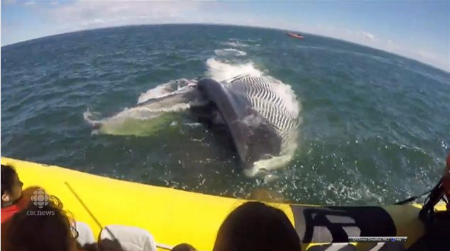 据加拿大广播公司的Loreen Pindera报道,法国人 Eric Mouellic 第一次来加拿大旅游,他在去魁北克省北部的Tadoussac观赏鲸鱼时,用视频拍下了少见的一幕。