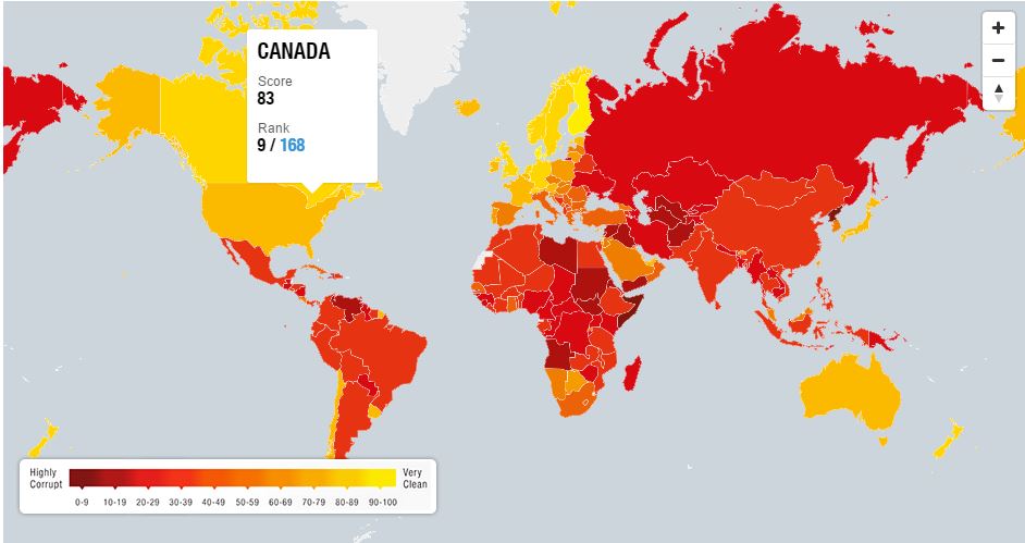 全球著名非营利性反贪污组织透明国际(Transparency International)自1995年起每年都发布全球贪污年度报告,公布世界各地企业界及民众对当地贪污情况观感。此次最新评选结果中,加拿大被认为是全球第9名的最清廉国家,美国排名第16位。
