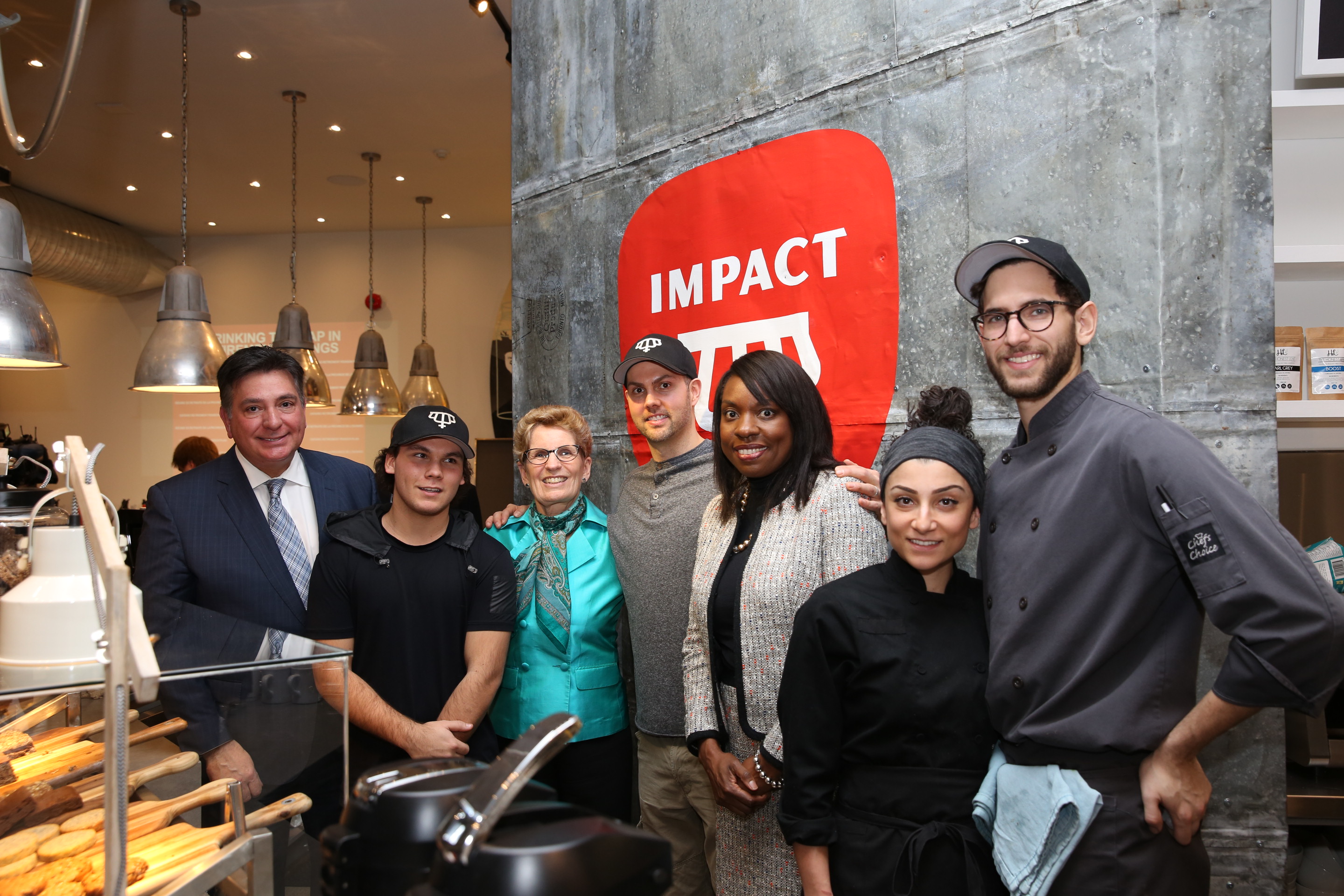 省长韦恩探访市中心一家咖啡店,宣布安省退休金计划拟订设计的最新决定,与电内员工分享好消息和合照