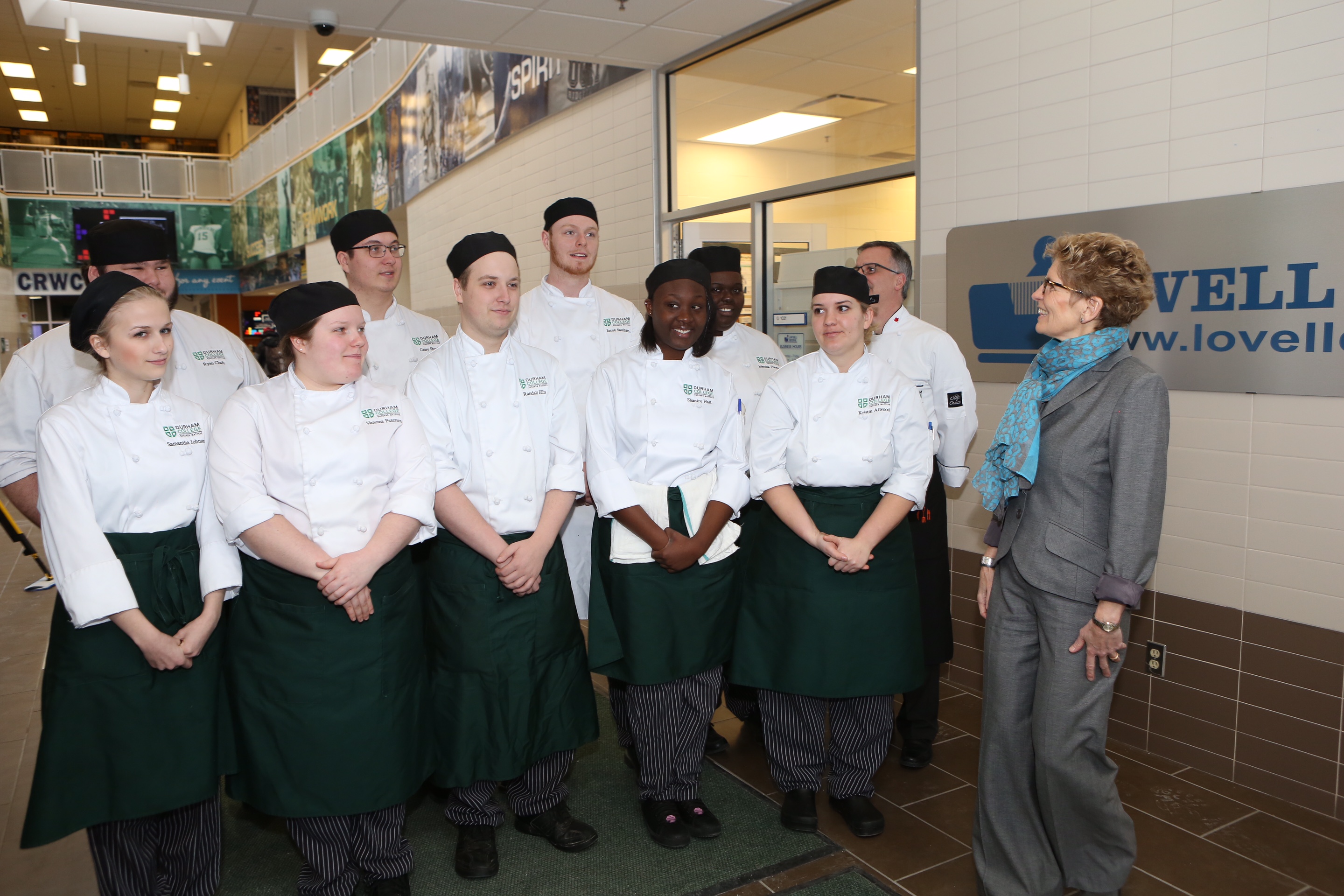 省长韦恩在参观Durham College时,与一班学员会面了解他们的学习情况。