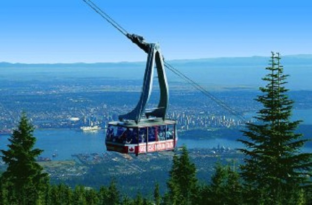 因为我们对温哥华道路都不熟悉,所以选择了公交。在温哥华,公交系统还是很靠谱的。从UBC大学校园到松鸡山脚下大概1个小时40分钟。上山的方式可以选择步行或者巨型缆车,下山时只能选择巨型缆车,不能步行;貌似还有直升飞机等更高大上的选择,但我没去了解。因为上次已经和同学尝试过徒步登山的辛苦,这次我们决定来回都乘坐缆车。这种缆车是北美最大最长的缆车,能同时乘坐几十人,途中可以尽情领略温哥华高山大海间的壮阔美景。