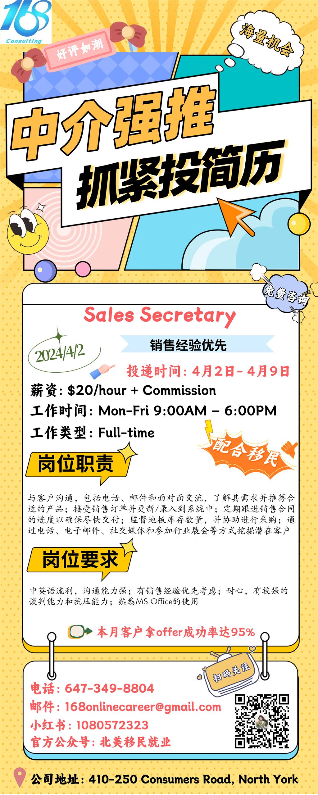 【168新岗】多伦多地板公司请Sales Secretary 1名(可移民)