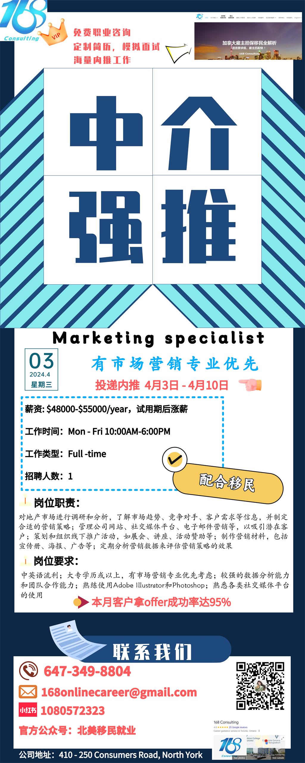 【168新岗】万锦地产公司招聘Marketing specialist 1名(可移民)