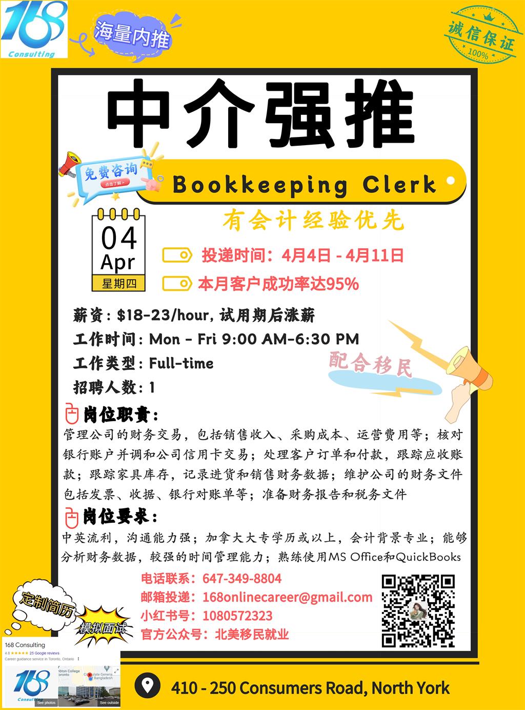 【168新岗】密西家具公司招聘Bookkeeping Clerk 1名(可移民)