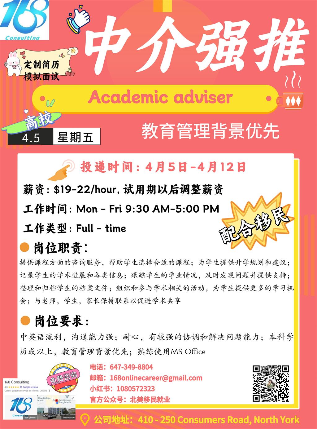 【168新岗】多伦多高校招聘Academic adviser 1名(可移民)