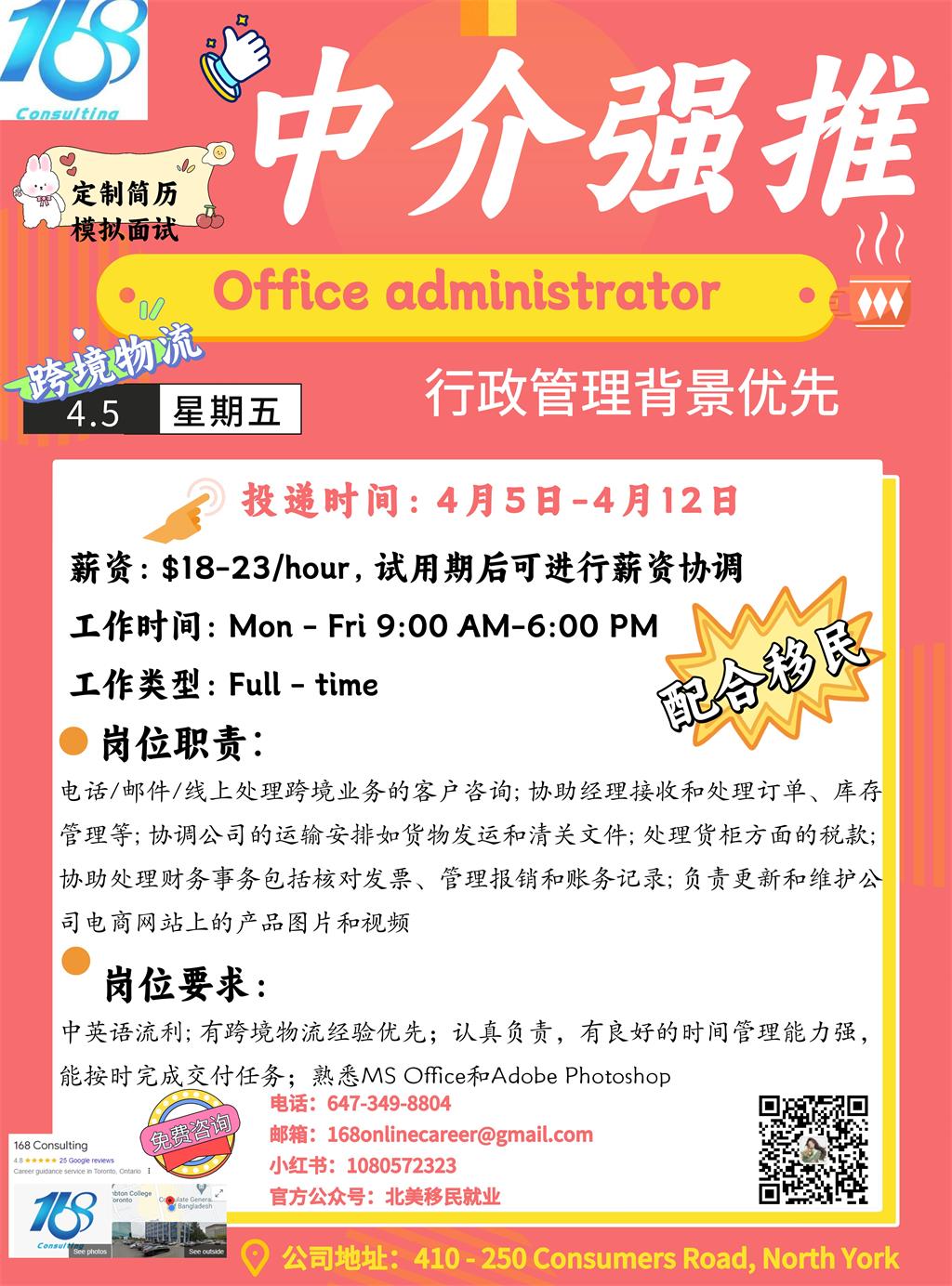 【168新岗】密西跨境物流公司招聘Office administrator 1名 (可移民)