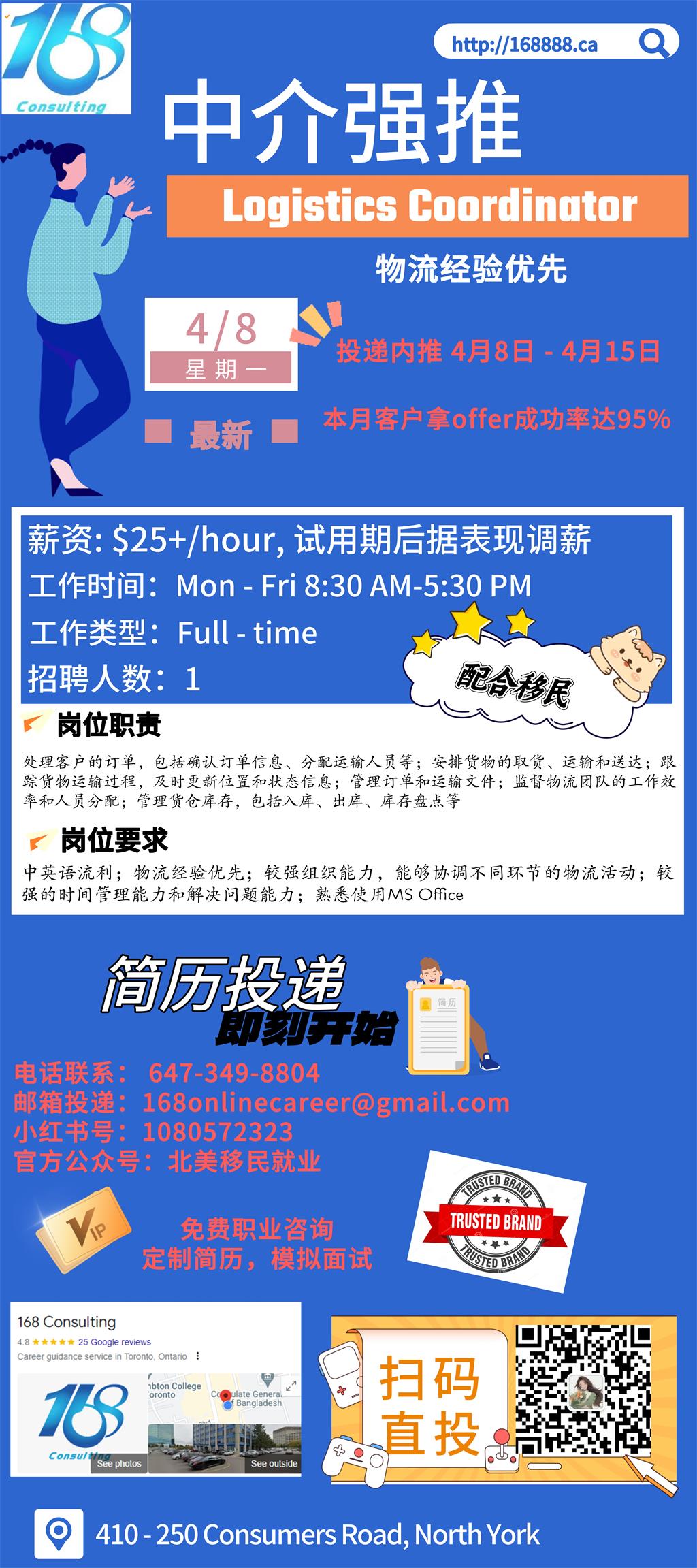 【168新岗】士嘉堡快递公司请Logistics Coordinator 1名 (可移民)