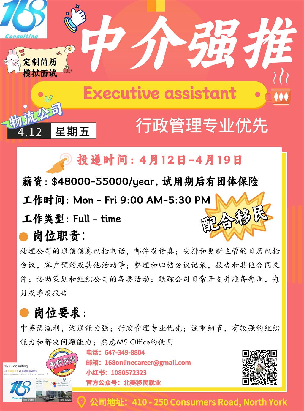 【168新岗】密西物流公司招聘Executive assistant 1名(可移民)