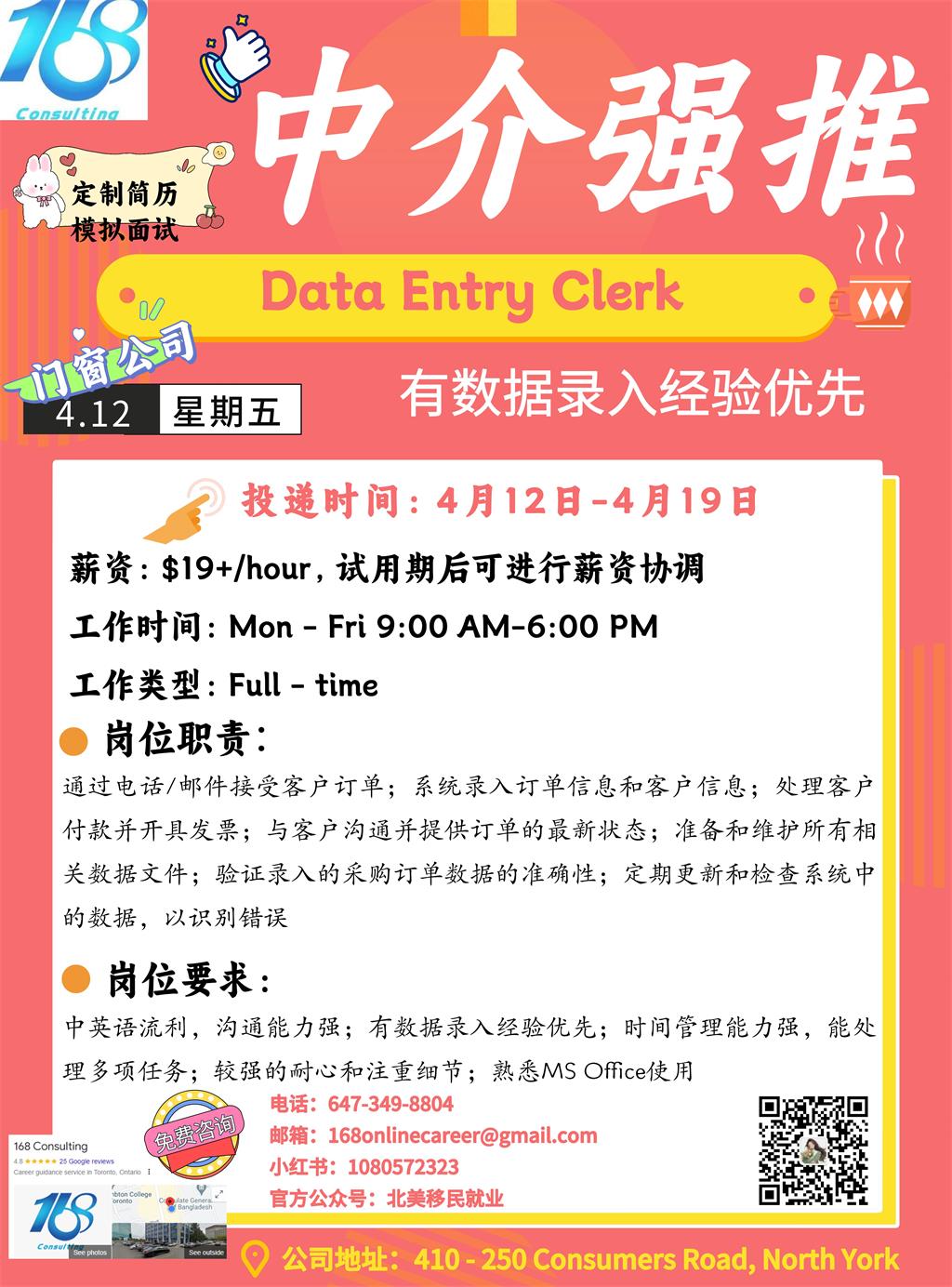 【168新岗】多伦多门窗公司招聘Data Entry Clerk 1名