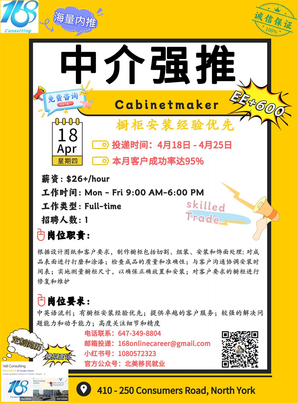 【168新岗】士嘉堡家具公司请Cabinetmaker 1名 (skilled trade+移民)