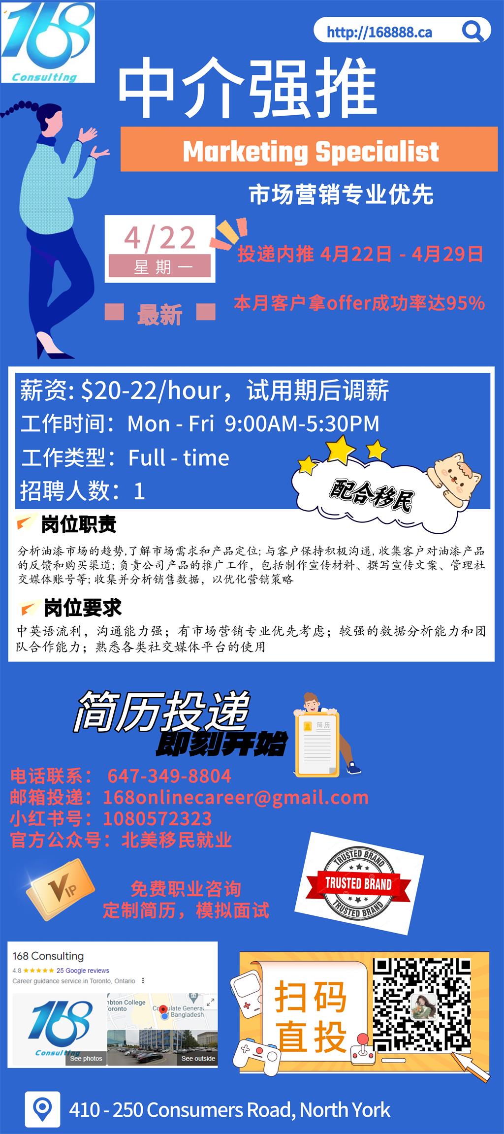 【168新岗】多伦多油漆公司招聘Marketing specialist 1名(可移民)