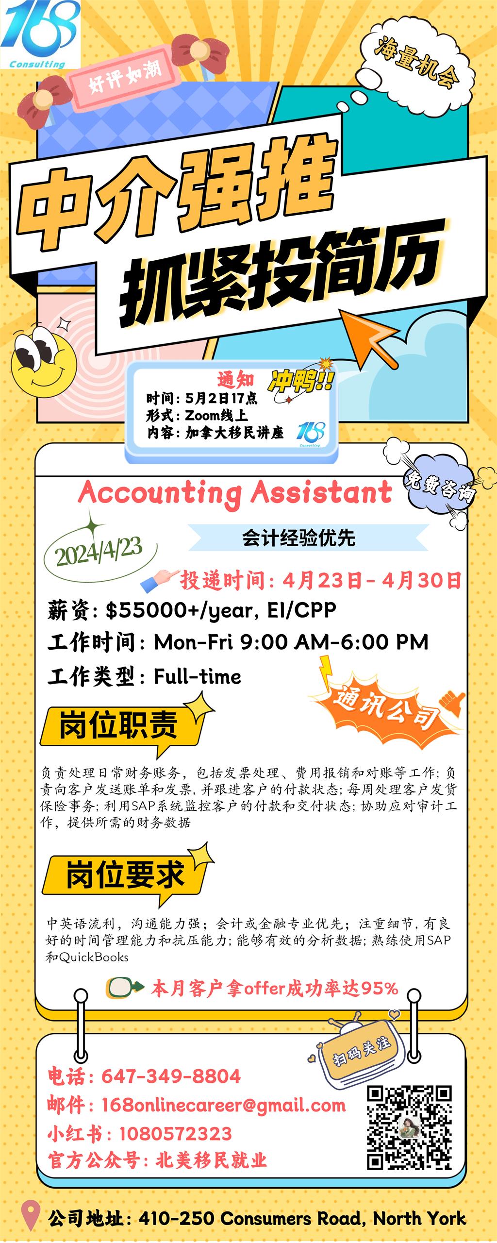 【168新岗】多伦多通讯公司招聘Accounting Assistant 1名