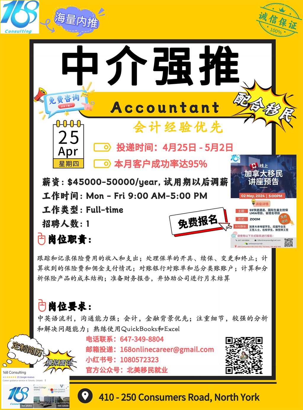【168新岗】东约克保险公司招聘Accountant 1名(可移民)