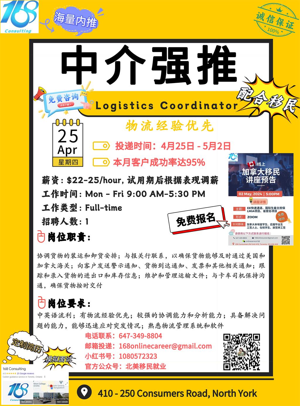 【168新岗】万锦物流公司请Logistics Coordinator 1名 (可移民)