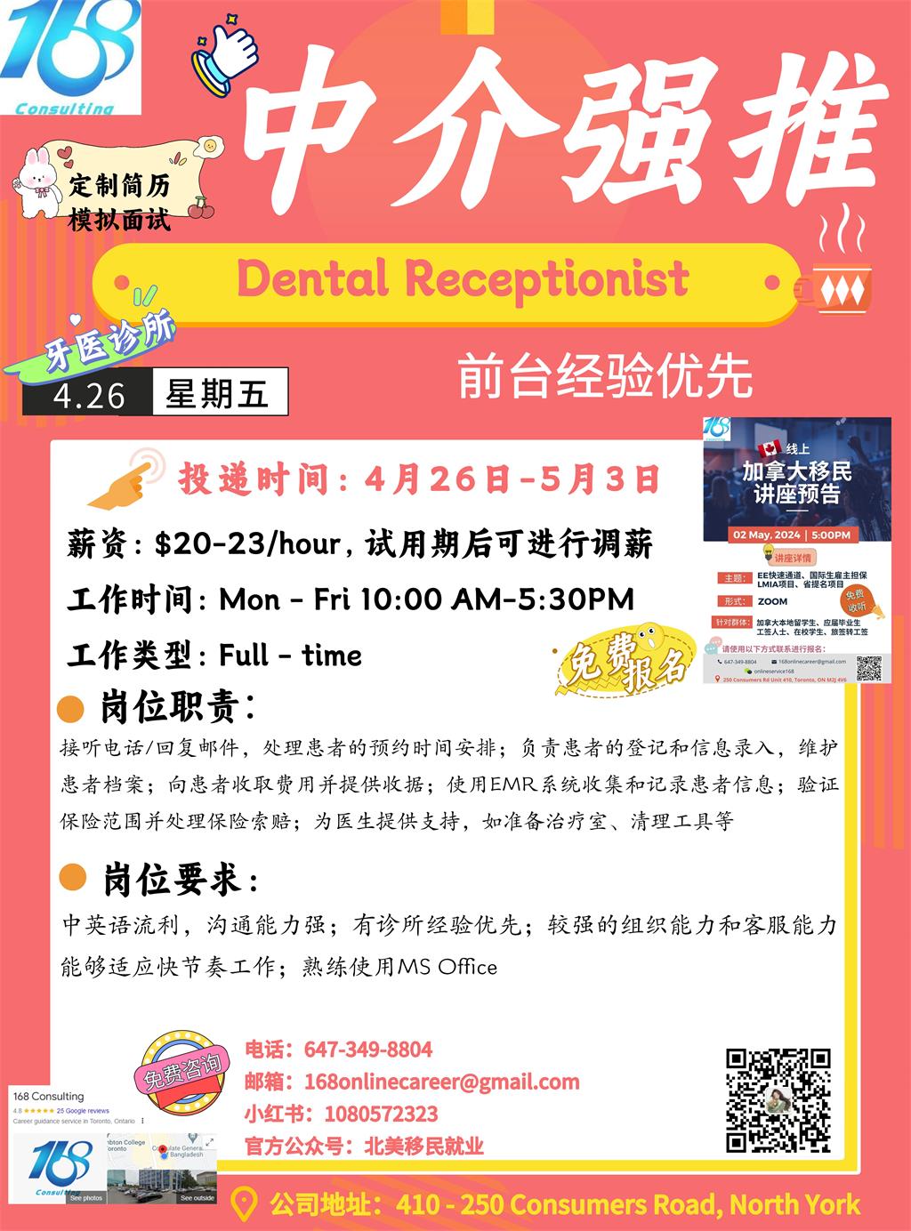 【168新岗】士嘉堡牙医诊所招聘Dental Receptionist 1名