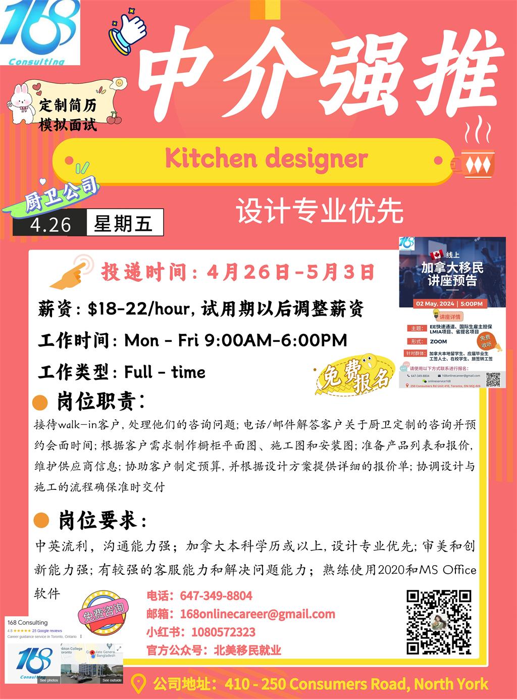 【168新岗】旺市厨卫公司请Kitchen Designer 1名(可移民)