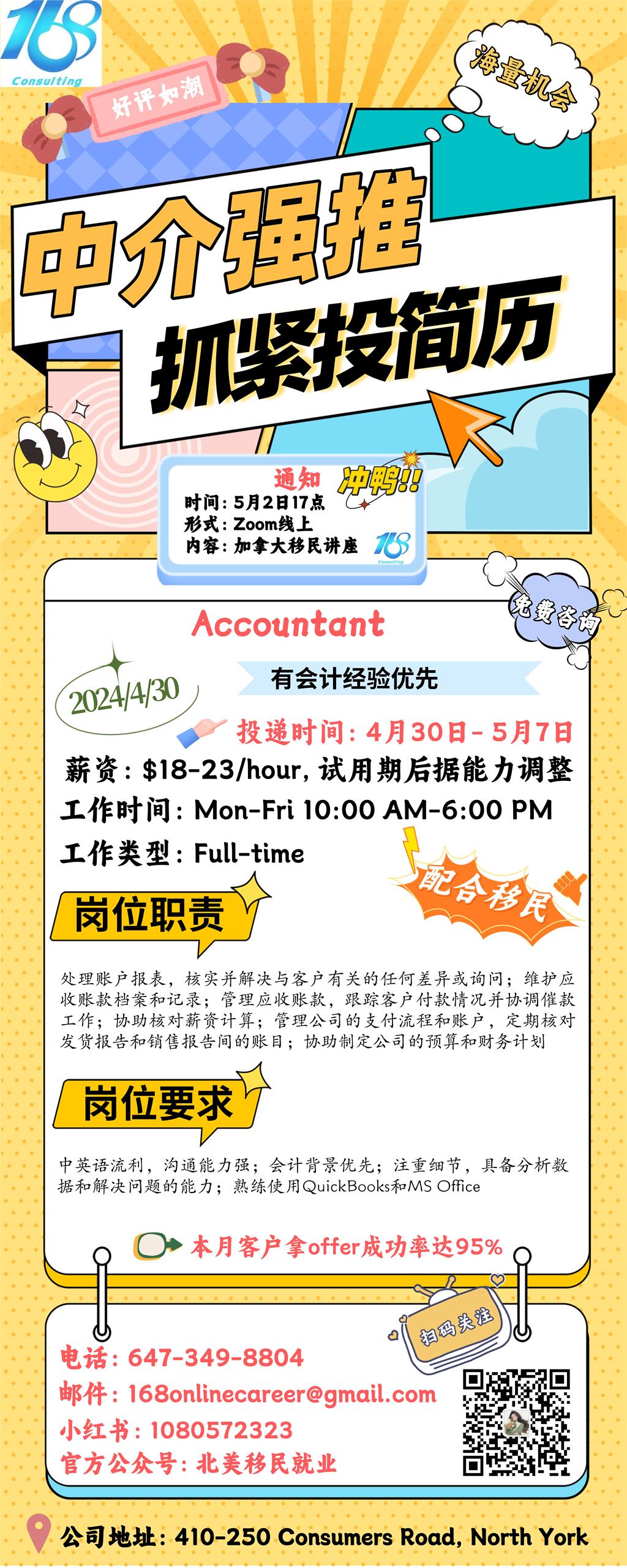 【168新岗】士嘉堡建筑公司招聘Accountant 1名(可移民)