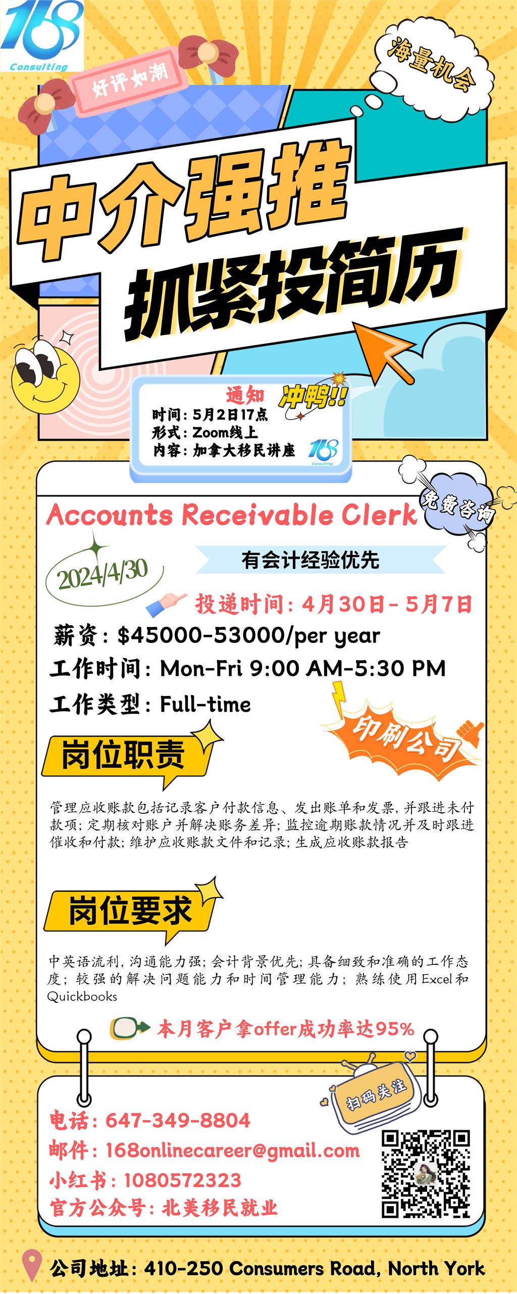 【168新岗】列治文山印刷公司招聘Accounts Receivable Clerk 1名