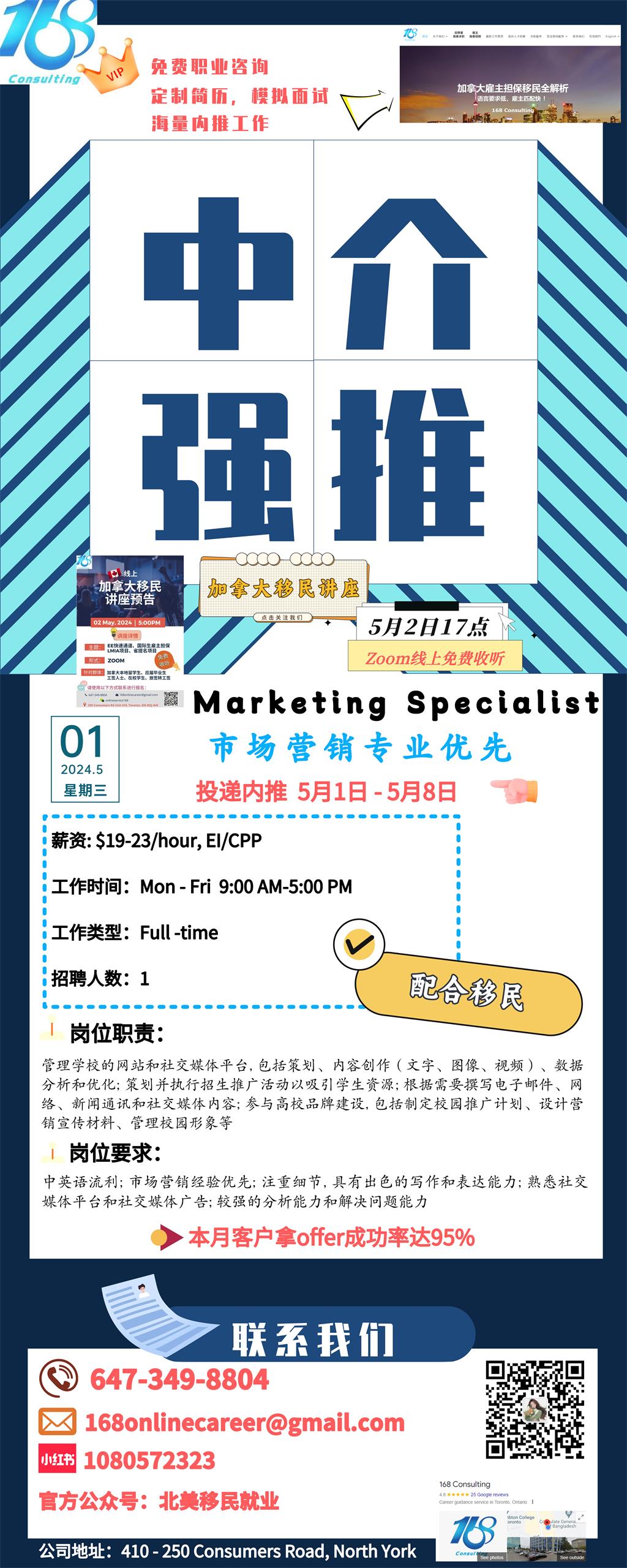 【168新岗】列治文山高校招聘Marketing Specialist 1名(可移民)